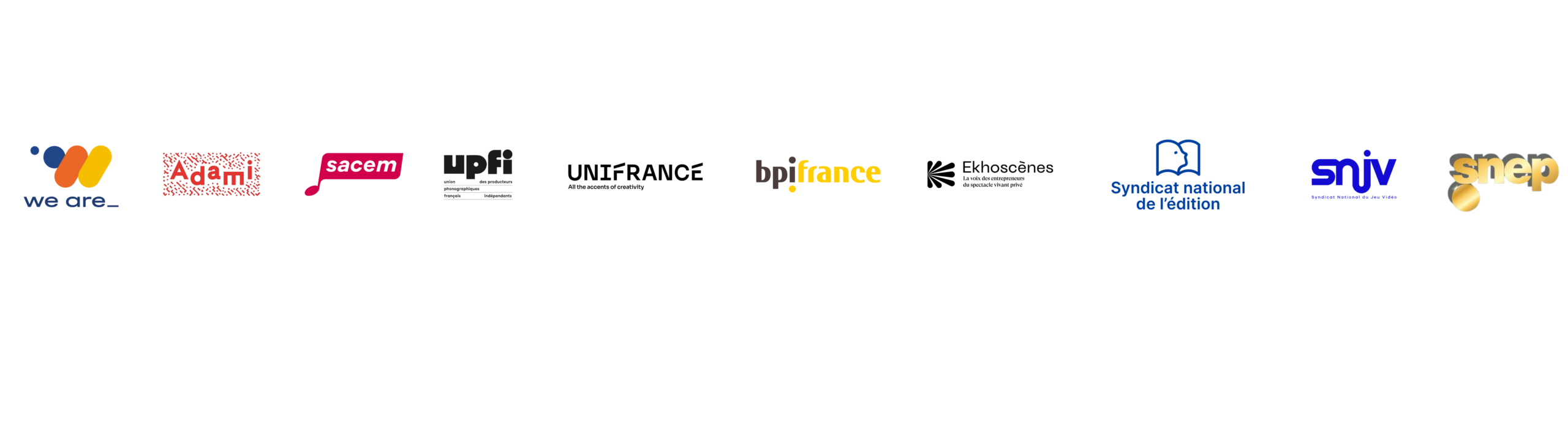 Initiative du club we are_, We Are Creative est une association qui fédère les acteurs des industries culturelles et créatives en France. Portée par la conviction que ces secteurs sont au cœur de la vitalité économique, artistique et sociétale, elle a pour ambition de promouvoir leur rayonnement, de valoriser leur potentiel de croissance et d’encourager les synergies entre leurs différents métiers. L’association rassemble les acteurs publics et privés du secteur : we are_, l’ADAMI, Ekhoscènes, le SNEP, Unifrance, le SNJV, l’UPFI, l’ADAGP, la SACEM, le SNE, avec le soutien du ministère de la Culture et Bpifrance.